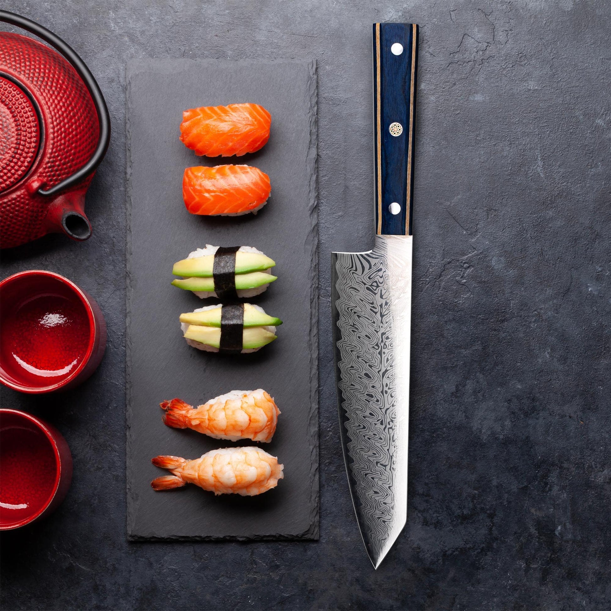 Forgé avec un noyau d’acier VG10 japonais et 67 couches d’acier Damas, il associe les techniques ancestrales de forgeage à une robustesse et une finesse de coupe sans égal. Sa lame ultra tranchante et fine dépasse les standards occidentaux pour des découpes d’une précision remarquable, même dans les gestes les plus techniques.