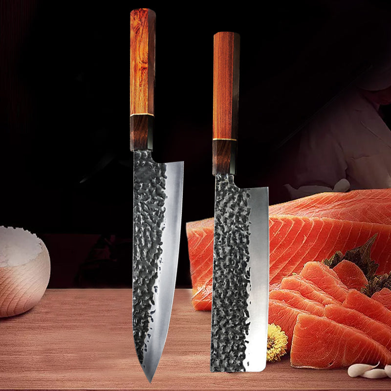 Ces couteaux ne sont pas seulement des outils, mais des œuvres d'art. Les poignées ergonomiques en bois précieux offrent une prise en main confortable et une esthétique raffinée. Le bois, soigneusement sélectionné pour sa beauté et sa durabilité, ajoute une touche d'élégance à chaque pièce. L'équilibre parfait entre la lame et le manche assure une maîtrise