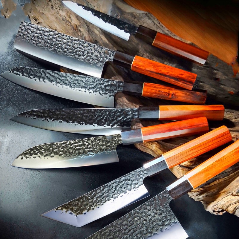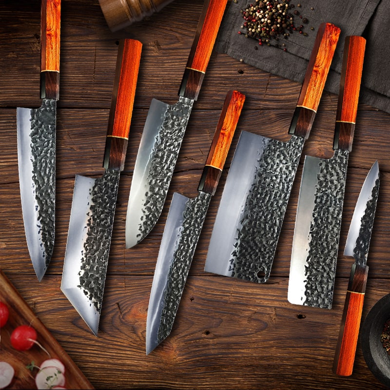 Découvrez l'excellence culinaire avec notre set complet de sept couteaux japonais en acier Damas, une fusion parfaite de tradition ancestrale et d'innovation moderne.