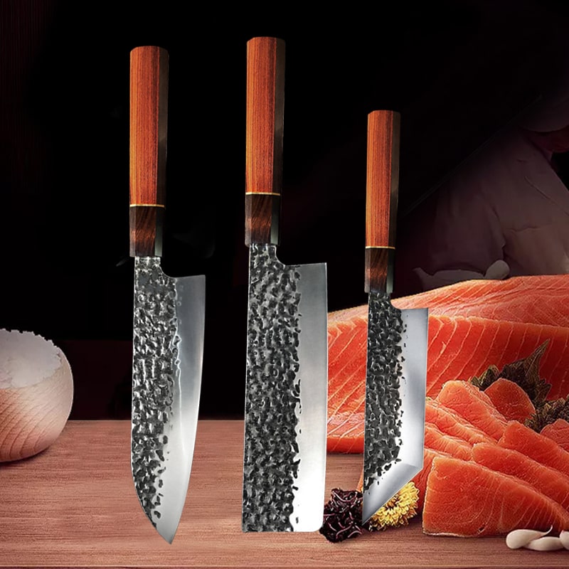 Ces couteaux ne sont pas seulement des outils, mais des œuvres d'art. Les poignées ergonomiques en bois précieux offrent une prise en main confortable et une esthétique raffinée. Le bois, soigneusement sélectionné pour sa beauté et sa durabilité, ajoute une touche d'élégance à chaque pièce. L'équilibre parfait entre la lame et le manche assure une maîtrise